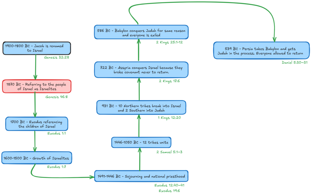 The graph above gives you a rough estimate of the Biblical times for each event. Each of these is outlined in the Bible itself, as referenced above, and the verses are provided to help with researching. You will likely need to read more than a single verse to get the context, and some are not entirely clear about what is happening, but it is the best we can do at the moment. The primary point remains the same, though. Exodus provides extensive detail about the covenant that God’s chosen people must follow. It is not only about following the 10 Commandments, but a lot more. If these rules being broken are what condemned the Northern Tribes to their fate and also nabbed the Southern Tribes, then how could it be possible for anyone to return to those rules without meeting each and every one of them simultaneously? If there are no records available, as the Bible proclaims, to prove you are a Jew, and by your own actions you are failing to meet the rules of the covenant, how could you be among the chosen people? If God never told the Jews to return, but instead instructed them to settle where they were, how could you be among the chosen people?